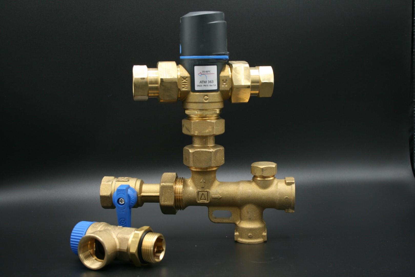 Kompakte Baugruppe für Durchlauferhitzer und solarbeheizte Trinkwassererwärmer. Thermisch geregelte Warmwassertemperatur (mit Verbrühungsschutz). Alle relevanten Rückflussverhinderer an der richtigen Stelle. Hohe Zeitersparnis im Vergleich zur herkömmlichen Anfertigung aus vielen Einzelteilen.